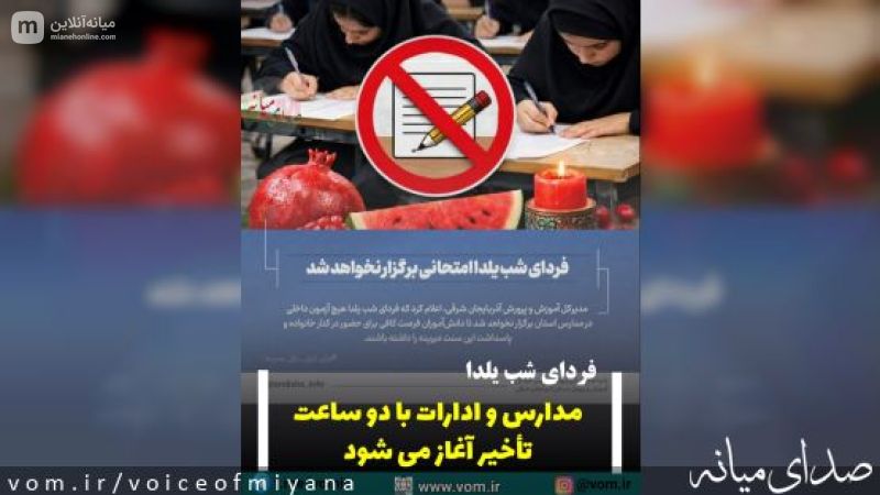 مدارس و ادارات فردا با ۲ ساعت تأخیر آغاز میشوند سخنگوی دولت: در راستای پاسداشت ارزشهای خانواده و آیینهای کهن ایرانی در شب یلدا، هیئت دولت مصوب کرد کلیه مدارس، ادارات و مؤسسات دولتی، فردا فعالیت خود را با ۲ ساعت تأخیر آغاز کنند./صدا و سیما