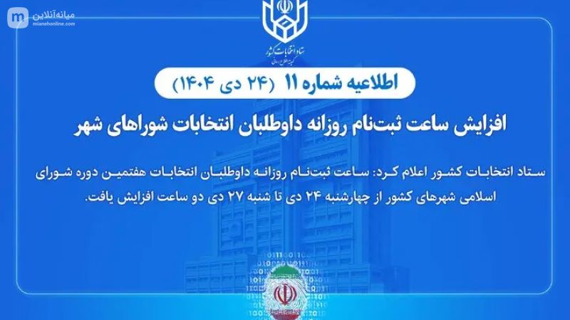 به آگاهی مردم شریف ایران اسلامی میرساند، با پیشنهاد ستاد انتخابات کشور و موافقت هیات مرکزی نظارت بر انتخابات هفتمین دوره شوراهای اسلامی کشور، ساعت ثبتنام روزانه داوطلبان انتخابات هفتمین دوره شورای اسلامی شهرهای کشور از چهارشنبه ۱۴۰۴/۱۰/۲۴ تا شنبه ۱۴۰۴/۱۰/۲۷ دو ساعت افزایش یافت. لذا ثبتنام غیرحضوری و الکترونیکی از داوطلبان از ساعت ۸ تا ۱۸ صورت میپذیرد.