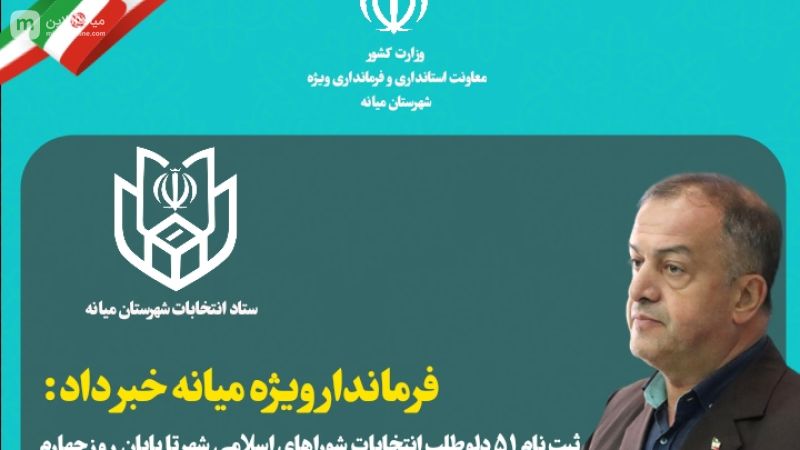 محمدرضا مشایخی رئیس ستاد انتخابات شهرستان میانه، با اشاره به آمار ثبت‌نام‌کنندگان داوطلبان انتخابات شوراهای اسلامی شهرهای (میانه،آچاچی،ترک،آقکند)، اظهار داشت: ۵۱ نفر تا پایان روز چهارم، با مراجعه به پنجره خدمات واحد وزارت کشور، ثبت نام خود را قطعی کردند.