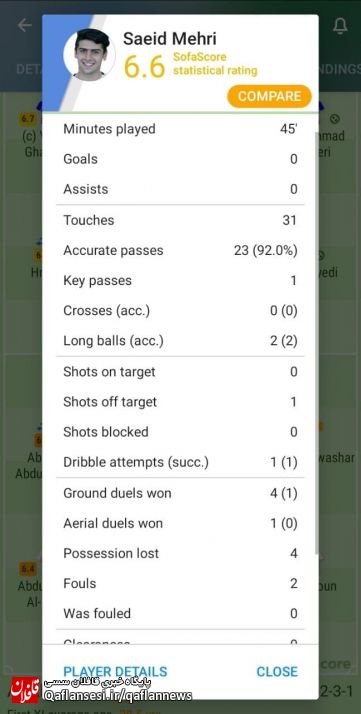 سعید مهری نمایش خوبی در این بازی داشت، دقت ۹۲ درصدی پاسها (بالاتر از میانگین تیمی استقلال)، پاسهای بلند بینقص، یک پاس کلیدی و چند قطع توپ خلاصهای از عملکرد یک نیمهای وی بود؛ که با توجه به اولین تجربهی بازی آسیاییاش کارنامهی قابل دفاعی برای سومین هافبک ارزشمند ایرانی از نظر سایت ترانسفرمارکت رقم زد.