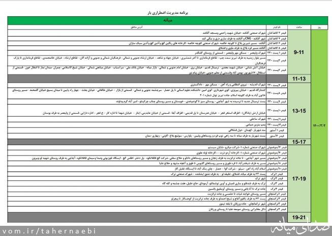 شایان ذکر است جدول زیر برابر اعلام مرکز کنترل و برای حداکثر میزان صرفه جویی برق و طبق برنامه زمانبندی تهیه شده است بدیهی است در صورتی که مشترکین محترم در مصرف برق صرفه جویی نمایند خاموشیهای آدرسهای مورد نظر تعدیل خواهد شد لذا به کلیه مشترکین ارجمند توصیه میگردد در زمان مدیریت اضطراری بار احتمالی اعلام شده تا حد ممکن از آسانسور و سایر تجهیزات برقی حساس استفاده نفرمایند.