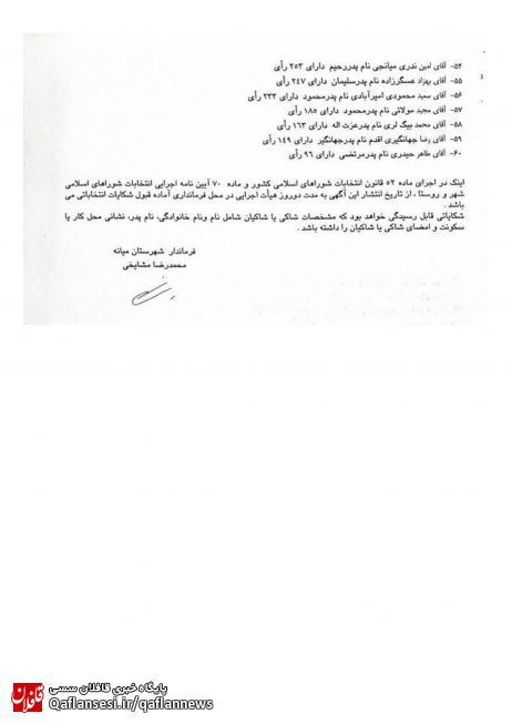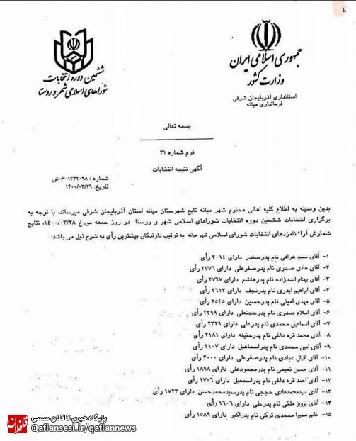 نتیجه انتخابات شورای شهر میانه آگهی نتیجه انتخابات شورای شهر (حوزه انتخابیه میانه) قافلان سسی ۳۰ خرداد ۱۴۰۰ ساعت ۱۱:۳۰ مشاهده خبر در سایت اصلی