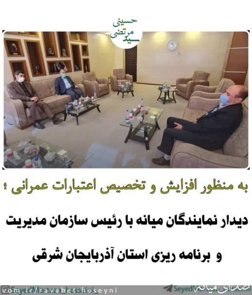 به منظور افزایش و تخصیص اعتبارات عمرانی؛  مهدی اسماعیلی و سید مرتضی حسینی نمایندگان مردم شهرستان میانه در مجلس شورای اسلامی با داوود بهبودی رئیس سازمان مدیریت و برنامه ریزی استان آذربایجان شرقی دیدار و گفتگو کردند.