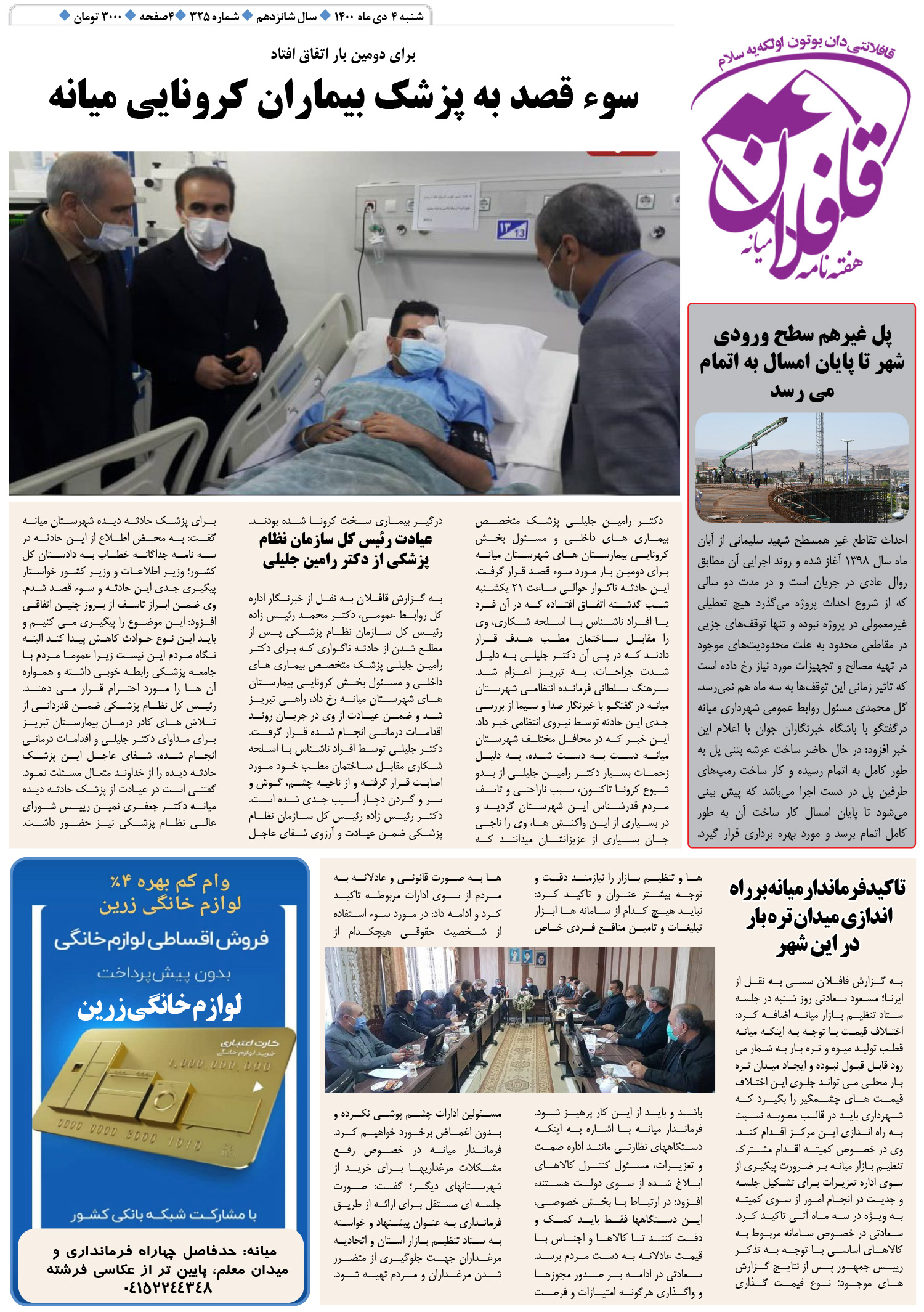 شماره 325 هفته‌نامه قافلان را با مطالب متنوع و اخبار هفته از روزنامه فروشی های سطح شهرستان تهیه فرمائید.