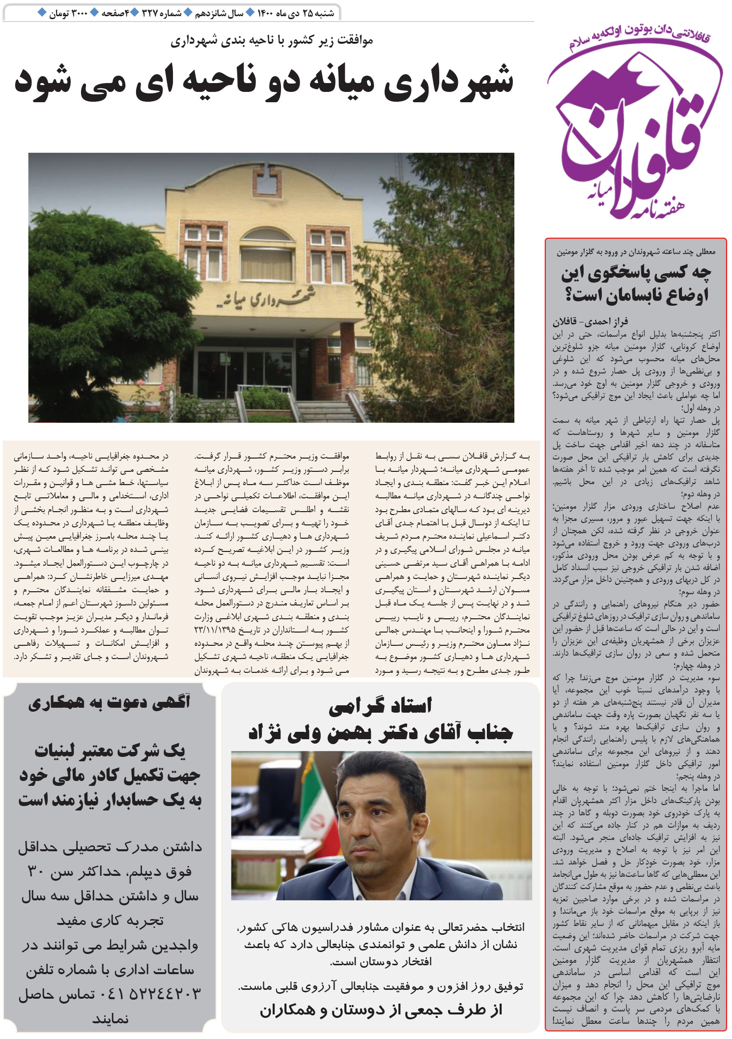 شماره 327 هفته‌نامه قافلان را با مطالب متنوع و اخبار هفته از روزنامه فروشی های سطح شهرستان تهیه فرمائید.