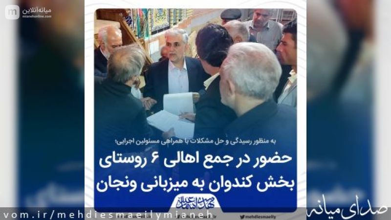 مهدی اسماعیلی نماینده مردم شهرستان میانه در مجلس شورای اسلامی به همراه تعدادی از روسای ادارات خدمات رسان به منظور رسیدگی به مشکلات اهالی بخش کندوان در روستای ونجان و با حضور اهالی روستاهای اطراف از جمله کسلان، نقاباد، تجره رود، شیویار، نودوزق حضور بهم رساند.