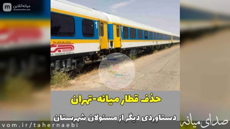 "میخواستم بدونم چرا قطار بعدازظهر میانه تهران رو از روز پنجشنبه ۲۱ اردیبهشت ۱۴۰۲ از گردونه تردد حذف خواهند کرد؟نمایندگان محترم سرتونو گرم شاسی بلند نکنین،بیایین جواب بدین؟باز با اون فرسودگی کلی مسافر جابجا میکرد،لطفا مسئولین جواب بدن،اون هلی کوپتر اورژانس کجاست؟آشیانش که به بهره برداری رسید پس کی قراره امداد رسانی کنه؟آب سالم گرمی چیشد؟همه جا پر شده بود از اخبار که دو سه روز دیگه آب سالم به میانه خواهد رسید،پس چی شد،لوله‌ها سوراخ شدن حتما نشت کرده"
