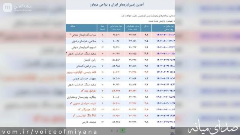 فوری گزارش مقدماتی زمین‌لرزه ?بزرگی: 5.9 ?محل وقوع: استان آذربایجان غربی - حوالی خوی ?طول جغرافیایی: 44.90 ?عرض جغرافیایی: 38.59 ?عمق زمین‌لرزه: 7 کیلومتر ?این زلزله در تبریز و اردبیل و میانه نیز احساس شد. ?همزمان زلزله ای ...