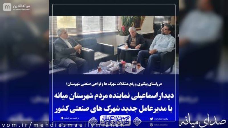درادامه پیگیریهای انجام گرفته در ارتباط با مسائل، نیازها و مشکلات شهرکها و نواحی صنعتی میانه و بخشهای کاغذکنان، کندوان و ترکمانچای، مهدی اسماعیلی نماینده مردم شریف شهرستان میانه در مجلس شورای اسلامی با مدیرعامل جدید شهرکهای صنعتی کشور دیدار و گفتگو کرد.