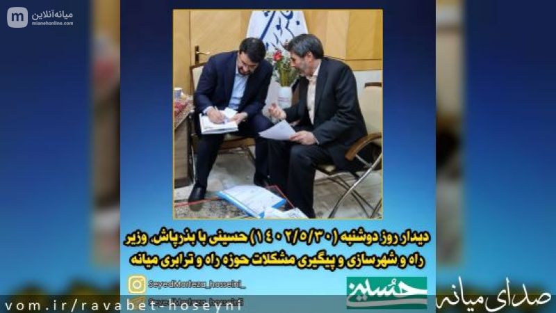 دیدار روز دوشنبه مورخ ۱۴۰۲/۵/۳۰ حسینی با بذرپاش، وزیر راه و شهرسازی و پیگیری مشکلات حوزه راه و ترابری میانه