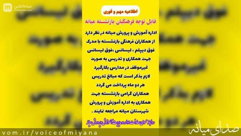 اطلاعیه آموزش و پرورش میانه درخصوص بکارگیری نیروهای بازنشسته