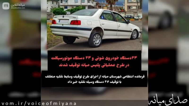 سرهنگ حسن رفیعی اظهار داشت: در پیرو  مطالبات و درخواست مردمی مبنی بر برخورد با خودروهای شوتی( تغییر ارتفاع، تغییر ظاهری خودرو)، آلودگی صوتی و فاقد پلاک و همچنین موتورسیکلت‌های مزاحم  و فاقد پلاک که نارضایتی بسیاری از سوی شهروندان به همراه داشته است، طرح برخورد با آنها  با هدف ارتقاء امنیت اجتماعی، انتظام بخشی و جلوگیری از بروز تخلفات حادثه ساز و هنجارشکنی در سطح شهرستان میانه به مرحله اجراء گذاشته شد.