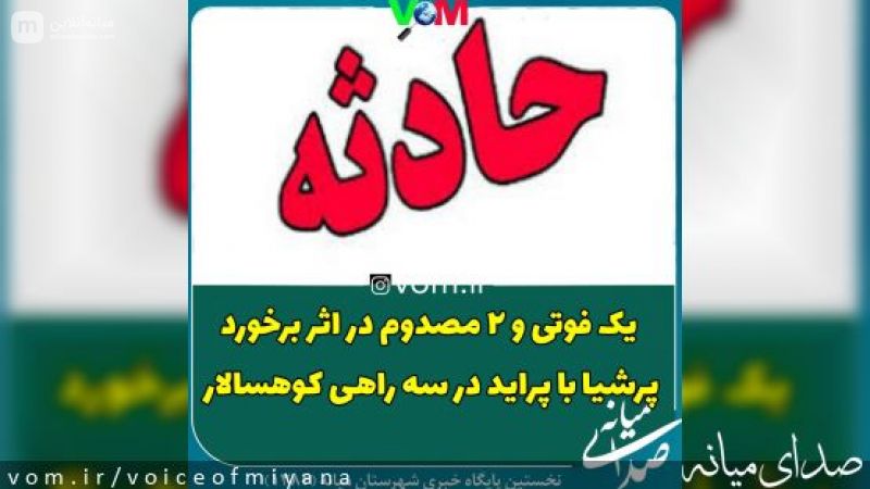 فرمانده انتظامی شهرستان میانه از برخورد یک دستگاه خودروی پژو پارس با یک دستگاه پراید خبر داد و گفت: در اثر این حادثه متاسفانه راننده پژو پارس در دم فوت و ۲ نفر از سرنشینان خودرو پراید به مراکز درمانی شهرستان انتقال یافتند.
