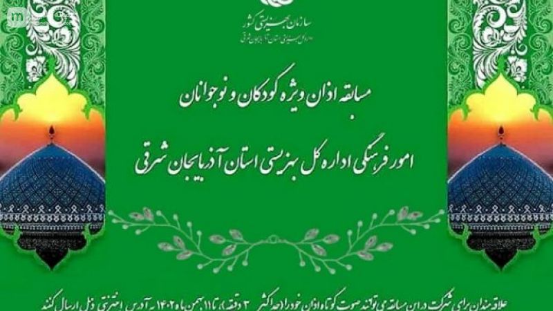 به گزارش روابط عمومی اداره بهزیستی شهرستان میانه: امور فرهنگی اداره کل بهزیستی استان آذربایجان شرقی، اقدام به برگزاری مسابقه اذان، ویژه کودکان و نوجوانان رده سنی ۷ الی ۱۶ سال نموده است، علاقمندان می‌توانند با مراجعه به آدرس اینترنتی ذیل در این مسابقه شرکت نمایند. قرعه کشی مسابقه در تاریخ ۱۲ بهمن ماه ۱۴۰۲ خواهد بود و به برگزیدگان برتر، جوایزی به رسم یادبود اهدا خواهد شد.