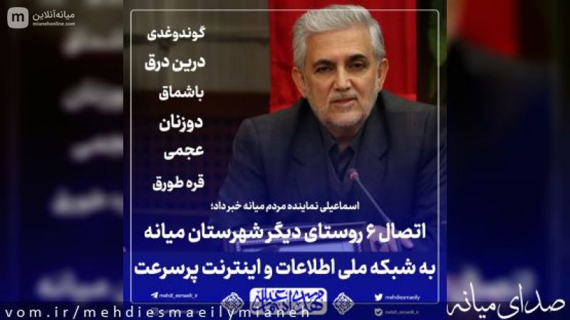 در راستای مکاتبات، جلسات و پیگیریهای مستمر و مداوم صورت پذیرفته از وزیر ارتباطات و مسئولین ذی ربط، مهدی اسماعیلی نماینده مردم شریف شهرستان میانه از برقراری و اتمام مراحل نصب سایت در روستاهای گوندوغدی، درین درق، باشماق، دوزنان، عجمی، قره طورق بخش مرکزی از توابع شهرستان میانه خبر داد و افزود: ساکنین و اهالی این روستا به شبکه ملی اطلاعات متصل و امکان دسترسی به اینترنت پرسرعت برای ساکنین محترم این روستا حاصل گردیده است.