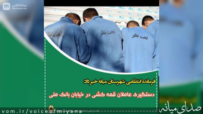 سرهنگ حسن رفیعی در تشریح این خبر اظهار کرد:در پی اعلام مرکز فوریت‌های پلیس ۱۱۰ مبنی بر یک فقره قمه کشی و ایجاد ضرب و جرح شهروندی در ابتدای خیابان بانک ملی، بلافاصله ماموران به محل اعزام شدند. این مقام انتظامی افزود:با بهره‌گیری از اطلاعات به دست آمده از تصاویر و همچنین شاهدان، هویت عاملان شناسایی شده و با هماهنگی دادستان دادسرای عمومی و انقلاب در نقاط مختلف شهرستان در عملیات پلیسی دستگیر شدند. وی یادآور شد: متهمان دستگیر شده به جرم خود مبنی بر ایجاد ضرب و جرح شهروند و قدرت نمایی با قمه اعتراف کردند و علت را اختلافات ملکی در یکی از روستاهای شهرستان عنوان کردند. فرمانده انتظامی شهرستان میانه به معرفی متهمین به مراجع قضائی اشاره کرد و گفت: پلیس با قاطعیت و جدیت کامل با ارازل و اوباش و افرادی که قصد بر هم زدن نظم و امنیت عمومی شهروندان را داشته باشند برخورد جدی خواهد کرد.