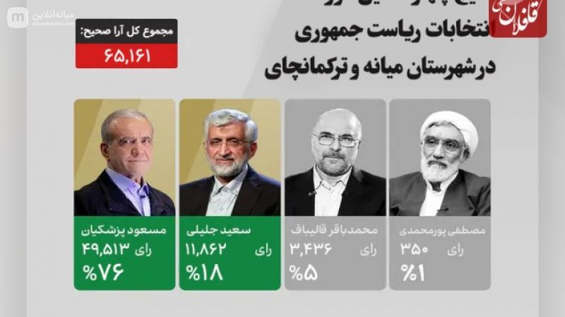 میزان کل آرای صحیح اخذ شده در انتخابات ریاست جمهوری ۱۴۰۳ در شهرستان میانه و ترکمانچای، ۶۵,۱۶۱ رای بوده که در زیر آرای ۴ کاندیدای ریاست جمهوری را بهتفکیک مشاهده میکنید.
