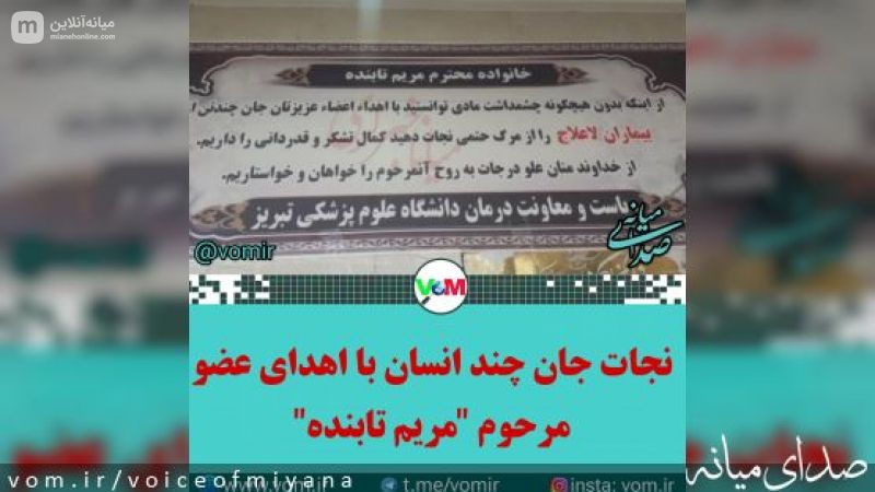 اعضای بدن مریم تابنده دختر ۲۶ ساله میانه ای که چند روز قبل بر اثر افت قند و نرسیدن اکسیژن به مغز دچار مرگ مغزی شده بود؛ به بیماران نیازمند عضو پیوندی، اهدا شد. گفتنی است پیوند کلیهها و کبد آن مرحوم به بیماران دارای نارسایی شدید، حیاتی دوباره را برایشان به ارمغان آورد. مرحوم مریم تابنده متولد سال ۷۷ و دارای مدرک کارشناسی ارشد رشته حقوق بوده است./ #میاناخبرلری