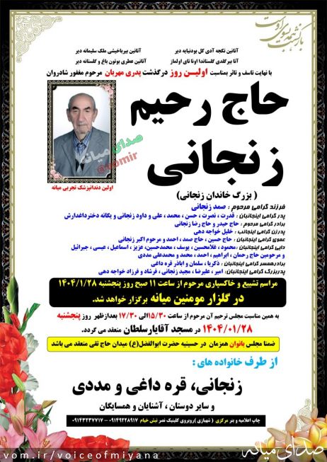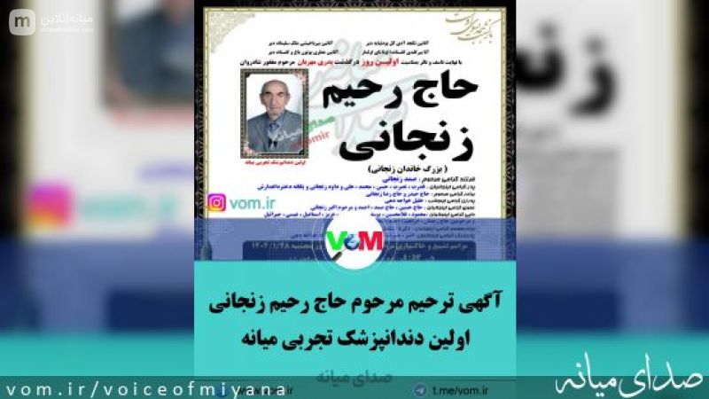 آگهی ترحیم مرحوم حاج رحیم زنجانی، اولین دندانپزشک تجربی میانه که از حدود ۷۰ سال پیش سالها، در شهر میانه مشغول به کار بود