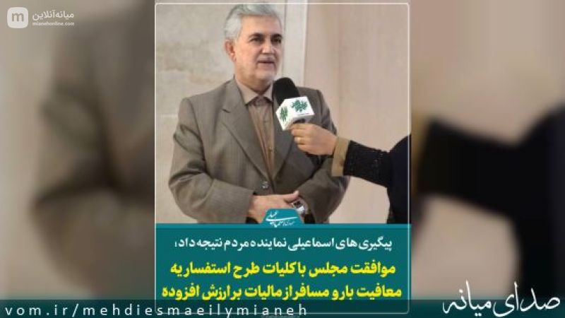 پیگیریها و نطق اسماعیلی نماینده مردم در صحن مجلس نتیجه بخش شد؛ موافقت مجلس با کلیات طرح استفساریه معافیت بار و مسافر از مالیات بر ارزش افزودهنمایندگان مجلس با کلیات طرح استفساریه درخصوص شمول معافیت جزء ۱۳ بند ب ماده ۹ قانون مالیات بر ارزش افزوده نسبت به کارمزد صدور بارنامه شرکتها و موسسات حمل و نقل با ۲۲۹ رأی موافق، ۵ رأی مخالف و ۲ رأی ممتنع از مجموع ۲۴۵ نماینده حاضر در صحن موافقت کردند.
