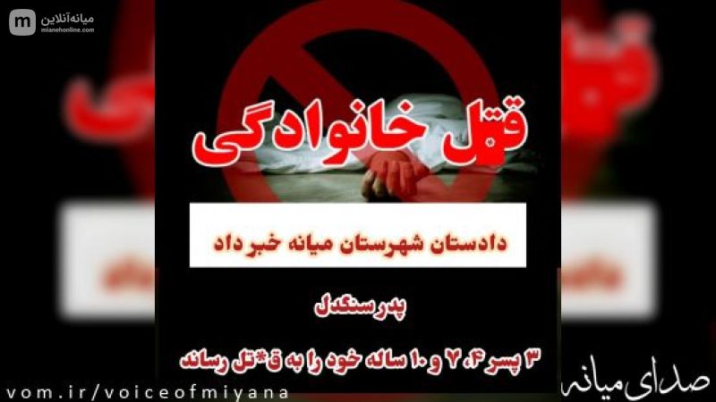 دادستان عمومی و انقلاب شهرستان میانه گفت: حسب گزارشات واصله فردی ۳۳ ساله که پدر خانواده بوده با استفاده از سلاح گرم، ۳ پسر خردسال ۴و۷ و ۱۰ ساله خود را در شرایط فجیع و دردناک در داخل خودرو شخصی به قتل رسانده و سپس خودش نیز با همان  اسلحه خودکشی می‌نماید. به گزارش روابط عمومی دادگستری، دادستان میانه درخصوص این خبر گفت: ظهر امروز برابر اعلام یکی از روستاییان با مرکز فوریت‌های پلیسی مبنی بر مشاهده اجساد چند نفر در داخل خودرو سواری در جاده برون شهری شهرستان، مراتب سریعا گزارش و اکیپ بررسی صحنه جرم به محل اعزام و با کشف اجساد، بلافاصله موضوع در دستور کار پلیس و دستگاه قضایی قرار گرفت. این مقام قضایی تاکید کرد: لازم است اصحاب رسانه، خبرنگاران و سایر مسوولان در خصوص اطلاع رسانی موضوع، از هیجان و عجله بی‌مورد اجتناب نموده تا ابعاد موضوع به نحو دقیق بررسی و متعاقباً اطلاع رسانی شود. دادستان میانه همچنین در پایان افزود: تحقیقات و بررسی دقیق ابعاد موضوع برای تشخیص علت و انگیزه قتل ادامه دارد.