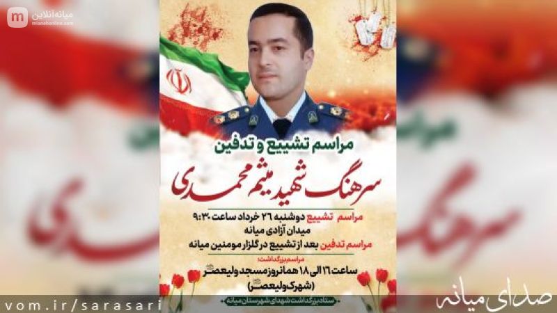 «بسم رب الشهدا و الصدیقین » مراسم تشییع و تدفین پیکر پاک سرهنگ شهید میثم مح­مدی ▪️مراسم تشییع: دوشنبه Û²Û¶ خرداد ساعت Û¹:Û³Û° صبح­ میدان آزادی میانه ▪️مراسم تدفین همزمان بعد از تشییع شهید در گلزار مومنین برگزار خواهد شد. ▪️مراسم بزرگداشت: بعد از ظهر همانروز ساعت Û±Û¶ الی Û±Û¸ مسجد شهرک ولیعصر