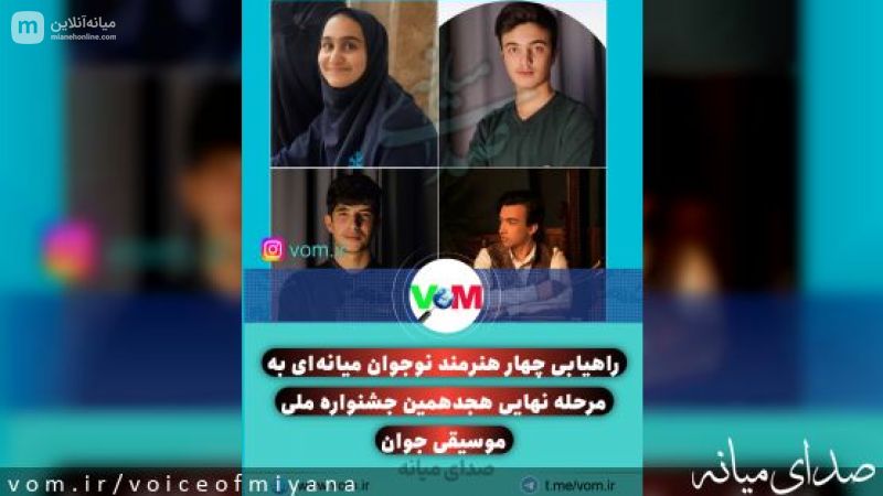 چهار هنرمند نوجوان از شهرستان میانه با درخشش در مراحل مقدماتی، موفق شدند به مرحله نهایی هجدهمین دوره جشنواره ملی موسیقی جوان راه یابند.