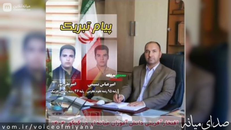 کسب رتبه ممتاز ۴۶ در گروه علوم ریاضی توسط امیرعلی پور و ۹۵ در گروه علوم تجربی توسط امیرعباس نسیمی همراه با موفقیت سایر دانشآموزان فرهیخته، نشاندهنده تلاش مستمر، انگیزه بالا و همت والای جوانان این دیار است. این موفقیت، مایه مباهات خانوادهها، فرهنگیان و جامعه آموزش و پرورش میانه است و سرمایهای ارزشمند برای آیندهای روشن و امیدوارکننده برای کشور عزیزمان محسوب میشود. با افتخار این دستاوردها را به دانشآموزان، خانوادهها و دبیران دلسوز تبریک میگوییم و امیدواریم الهامبخش سایر دانشآموزان برای فتح قلههای علم و دانش باشد. رحیم احمدی معاون مدیرکل و مدیر آموزش و پرورش میانه