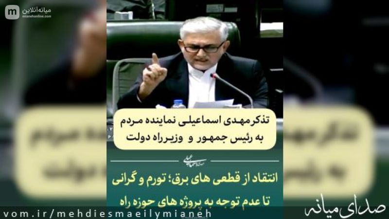 تذکر شفاهی مهدی اسماعیلی نماینده مردم شریف شهرستانهای میانه و ترکمانچای در جلسه علنی امروز چهارشنبه ۱۲ شهریورماه ۱۴۰۴ مجلس شورای اسلامی خطاب به رئیس جمهور و وزیر راه